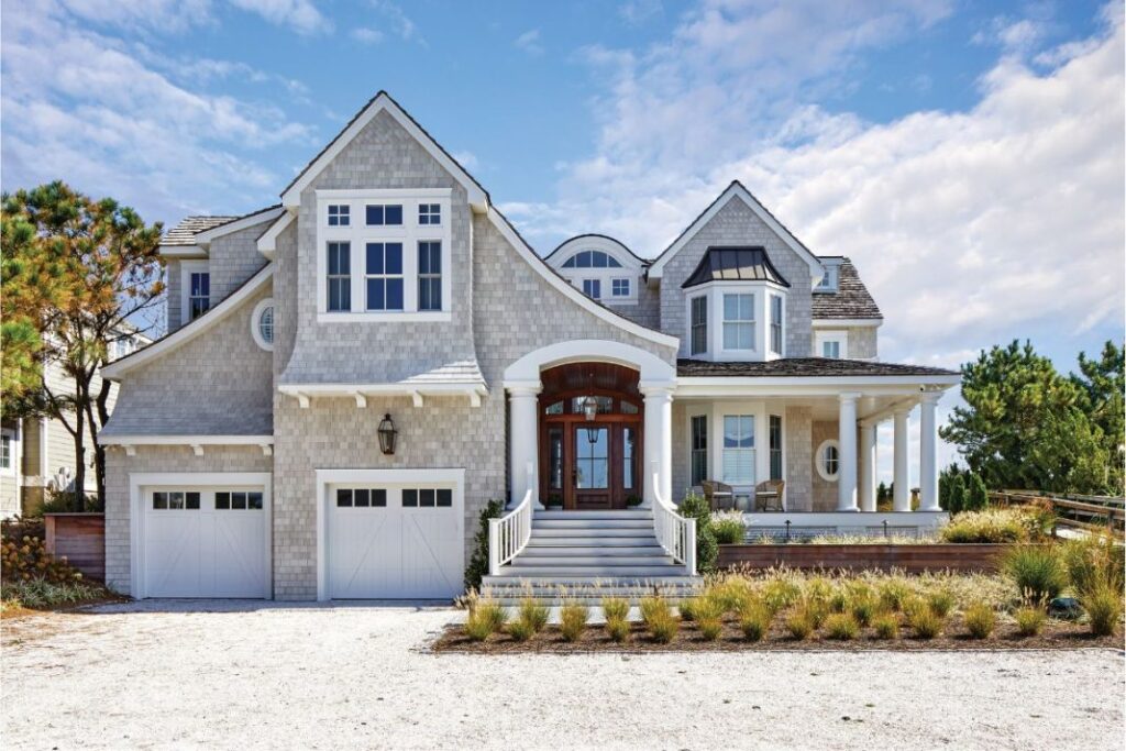 A classic New England-style beach house showcases timeless design with cedar shingles, pitched roofs, and wide porches. These homes are built to withstand cold coastal winds and stormy weather, often incorporating durable wood siding and raised designs.